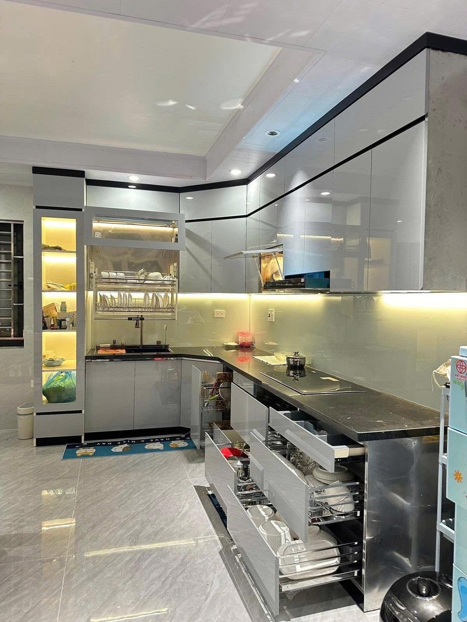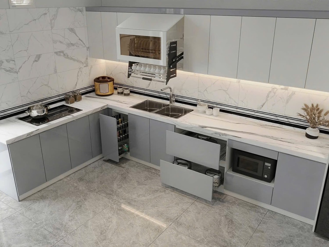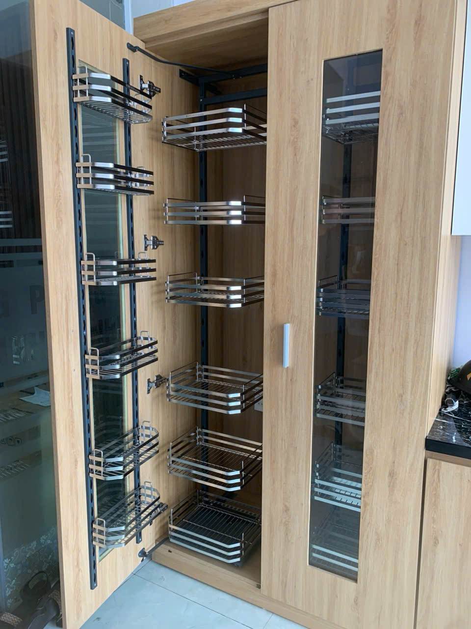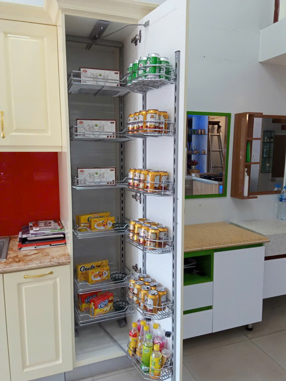 Công dụng của giá kho trong tủ bếp hiện đại, là giải pháp lưu trữ thông minh giúp tối ưu không gian ...
